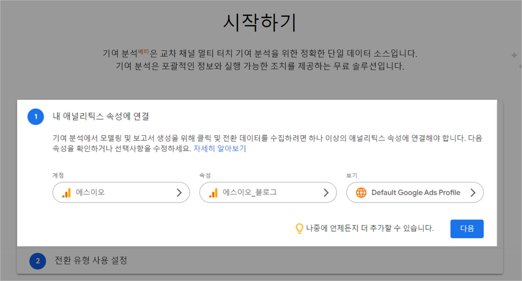 속성 이름 경우에도 블로그 명을 입력 후, 보고 시간대 "대한민국" 통화 "대한민국"으로 수정한다.