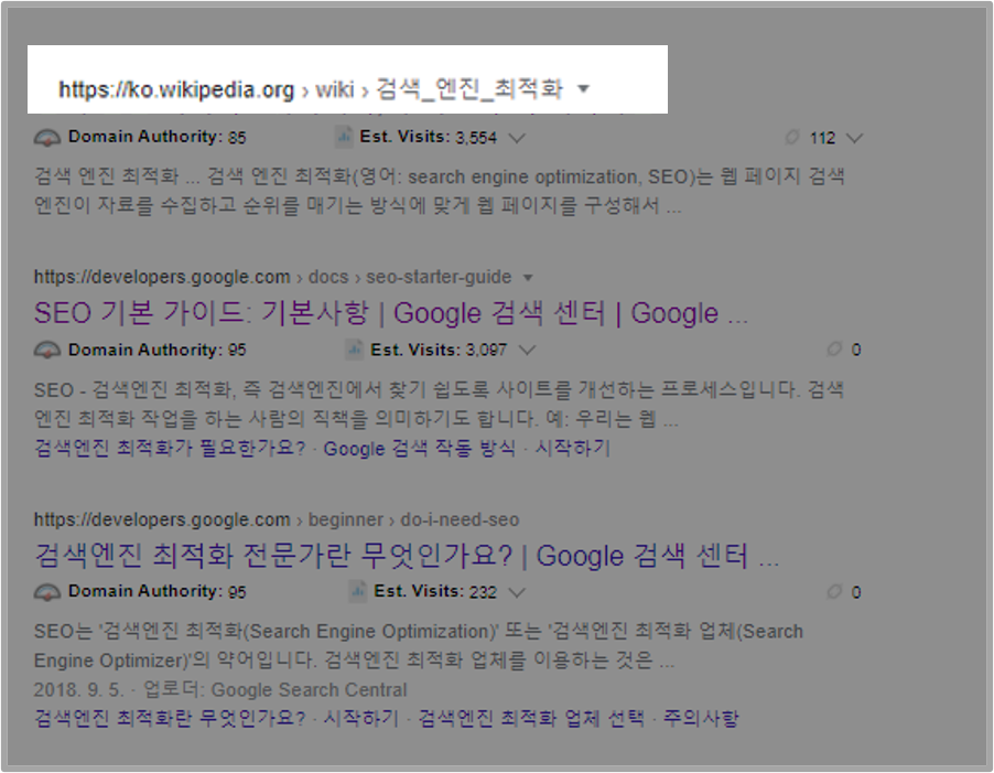 위와 같이 "검색엔진최적화"에 대해서 검색했을때 URL에 들어가 있는 경우 도움이 될 수 있다.
