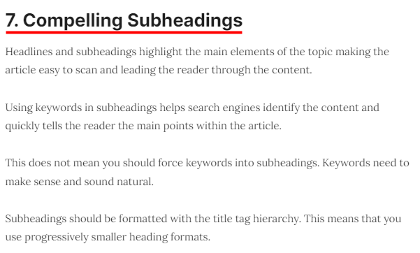 또한 부제목에 키워드를 사용하면 검색 엔진이 콘텐츠를 식별하는 데 도움이 되며, 요점을 신속하게 알려준다.
