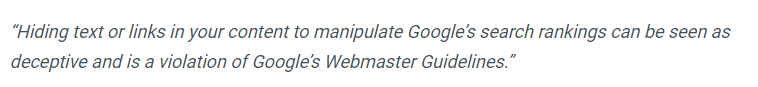 구글의 공식 지침에 따르면 검색 순위를 조작하기 위해 콘텐츠에 텍스트나 링크를 숨기는 것은 웹마스터 가이드라인을 위반하는 것이라고 발표했다.