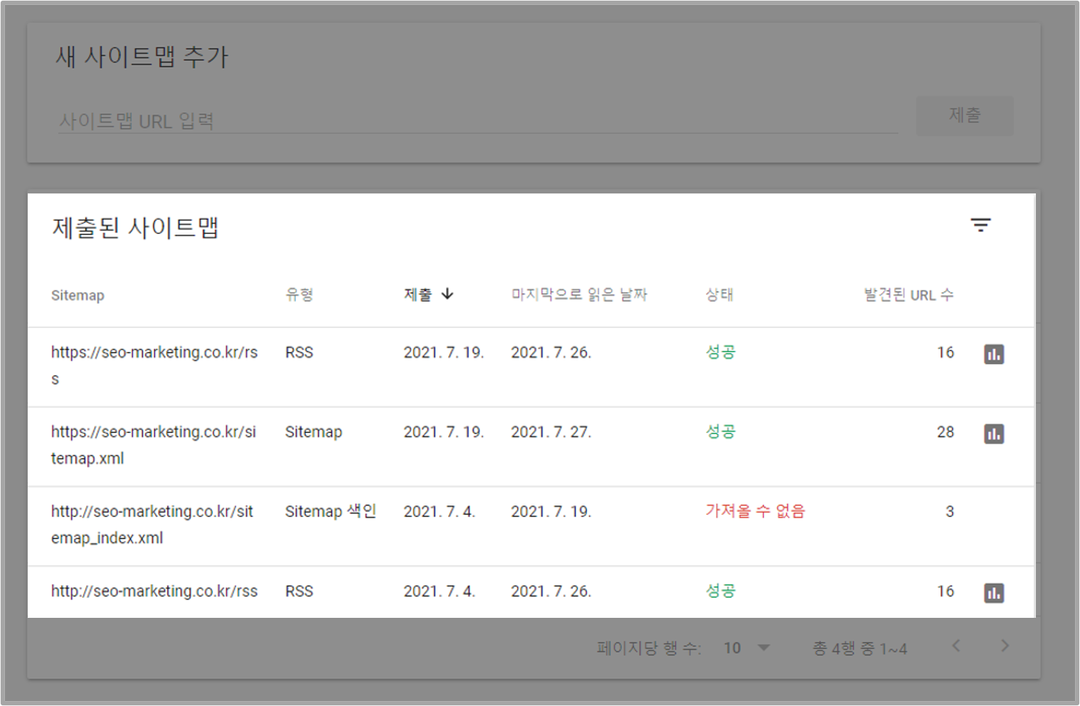이미 제출했다면 해당 페이지에 "제출된 사이트맵" 목록이 표시된다.