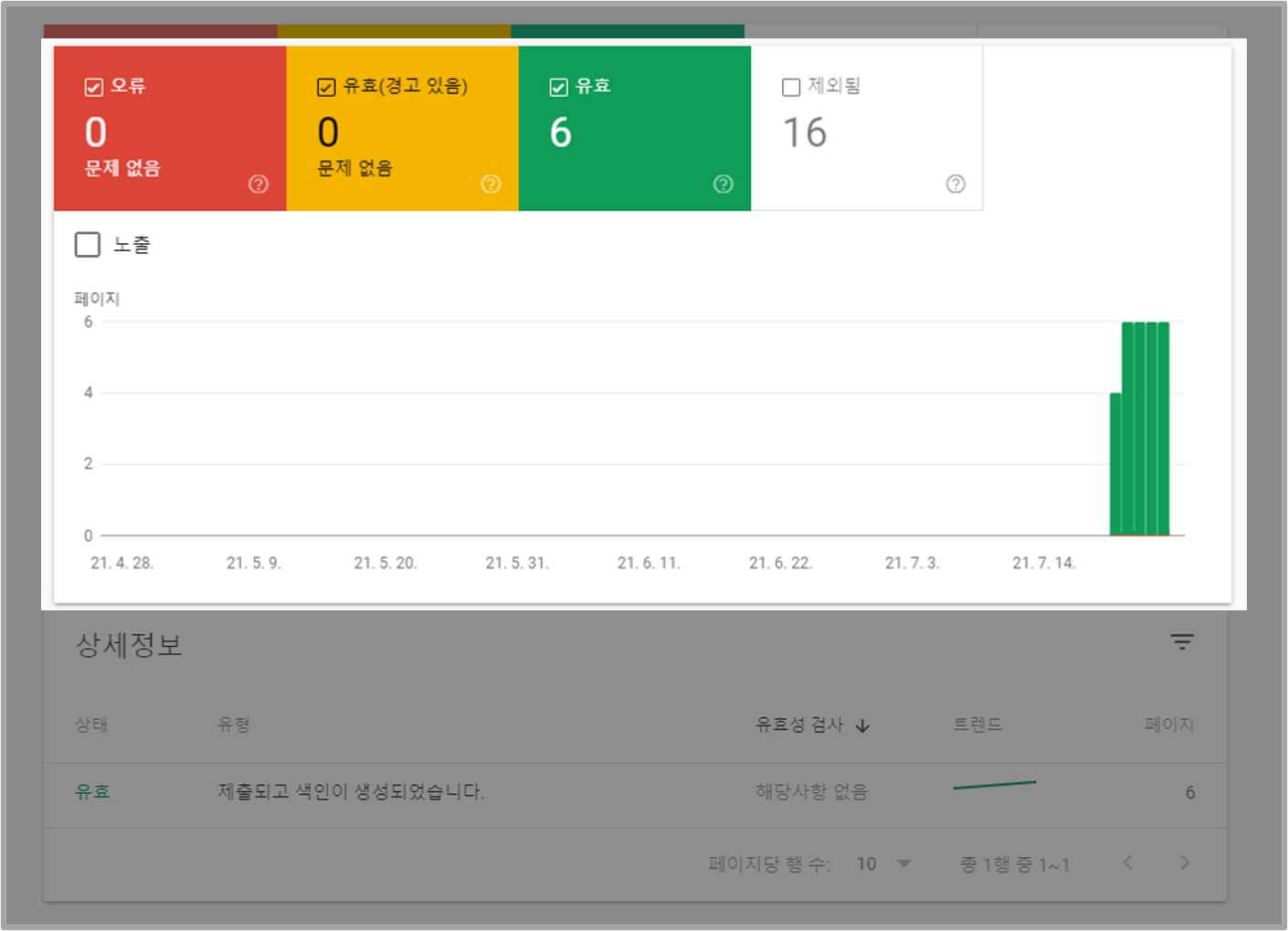 예를 들어, 필자 경우 6개 페이지가 색인되었고, 16개는 제외되었다.