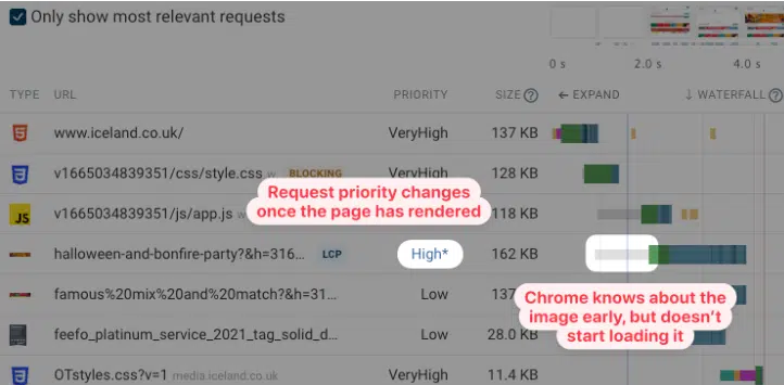 따라서 LCP 이미지가 처음에는 낮은 우선 순위로우선순위로 로드된 다음 나중에 높은 우선순위로 전환되는 것이 일반적이다.