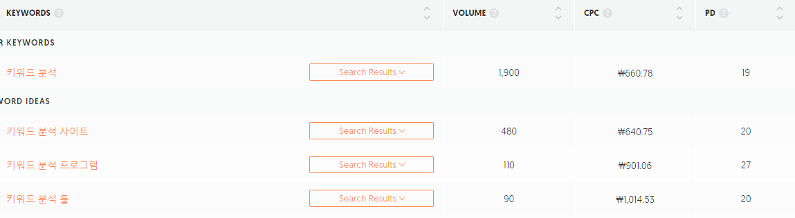 키워드 아이디어뿐만 아니라 실행 가능한 SEO 지표도 제공한다.