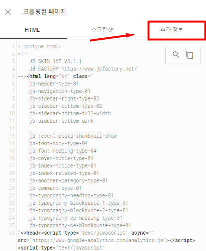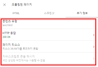 "크롤링된 페이지"를 누르면 위와 같이 HTML, 스크린샷 및 추가 정보가 나온다.