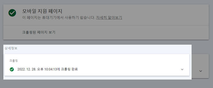 그리고 모바일 지원 페이지에서 모바일 친화성에 따른 크롤링 완료 메시지가 떴는지 보자.